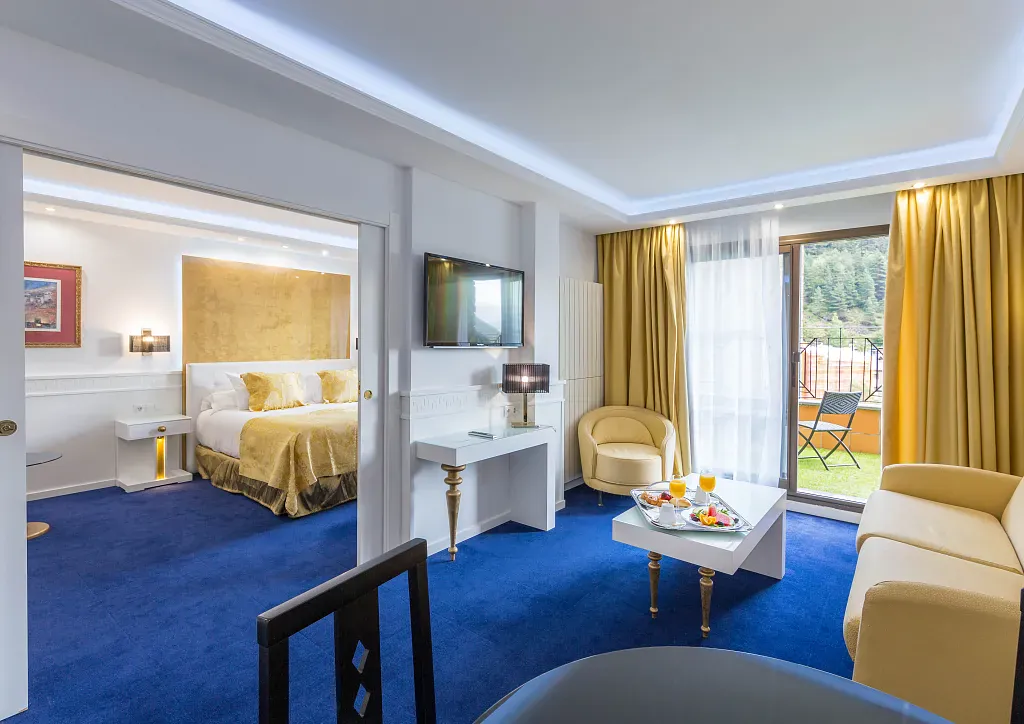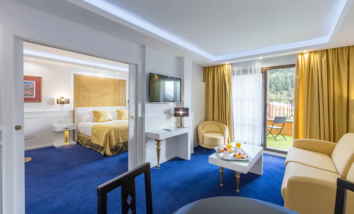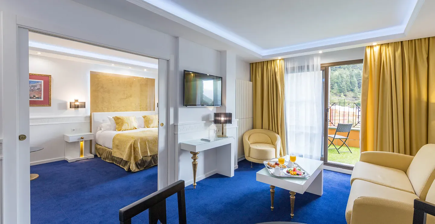 Una suite luminosa, ideal para quienes buscan el máximo relax en un entorno único de montaña. Disfruta de su jacuzzi privado, sala de estar independiente, y vistas al valle, la piscina y el telecabina