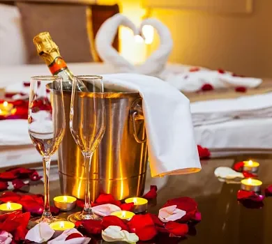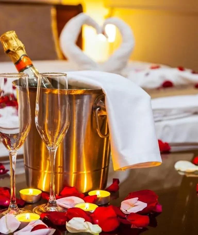 - Decoración romántica en la habitación: cisnes con pétalos, una rosa, velas y decoración en el cuarto de baño.