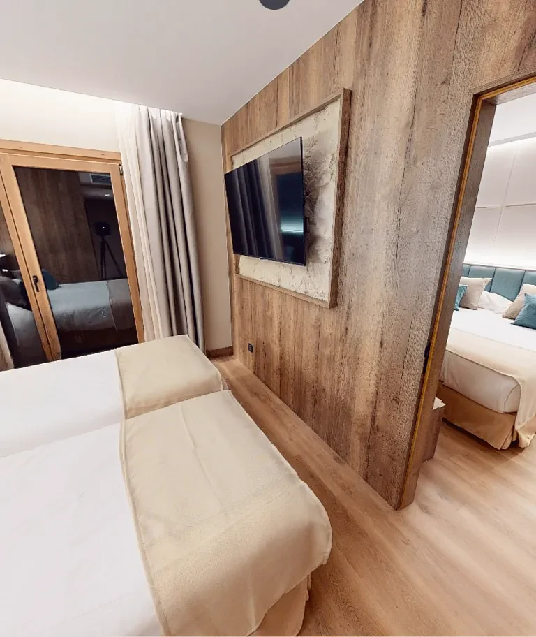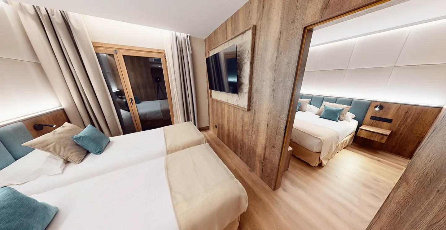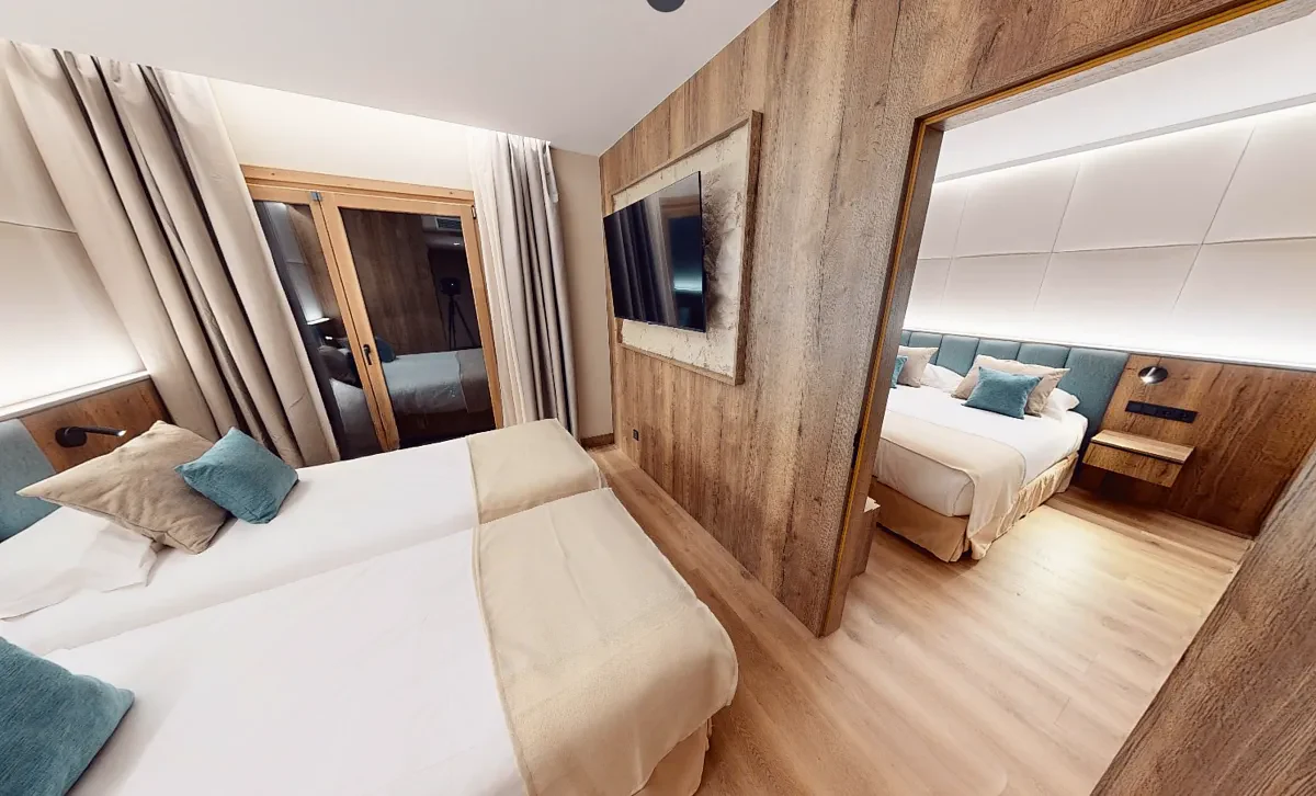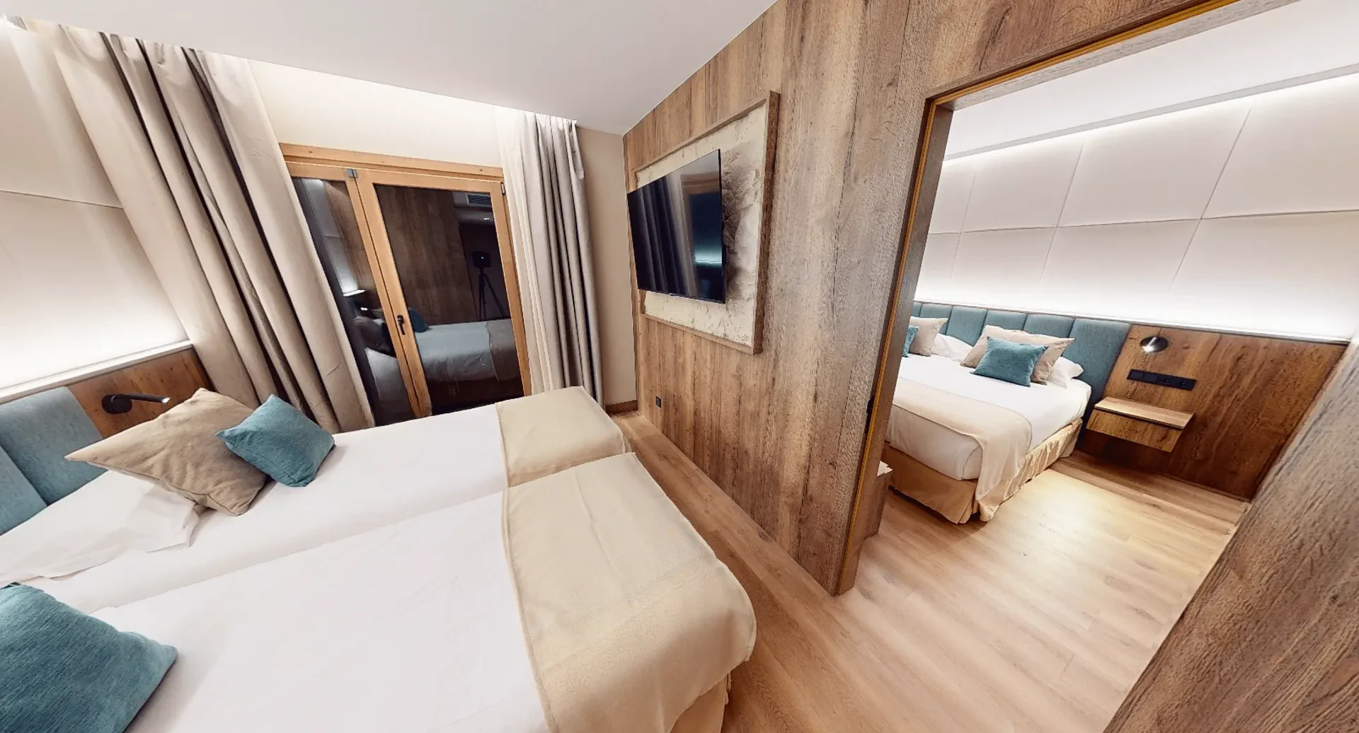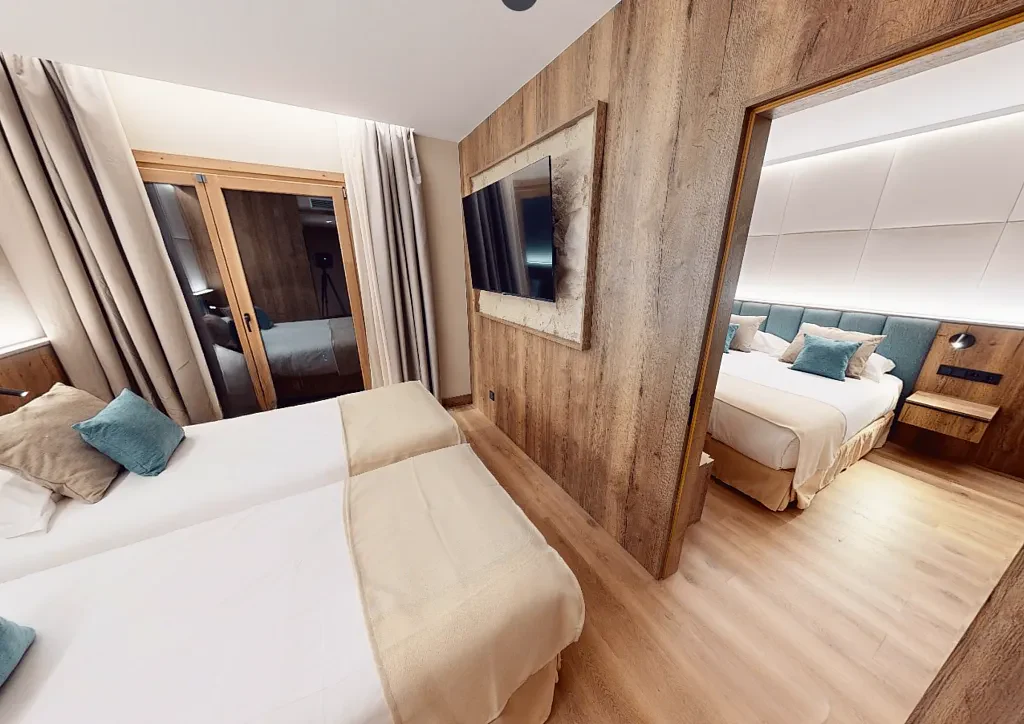 • Двуспальная кровать и две односпальные кровати, разделенные дверью.